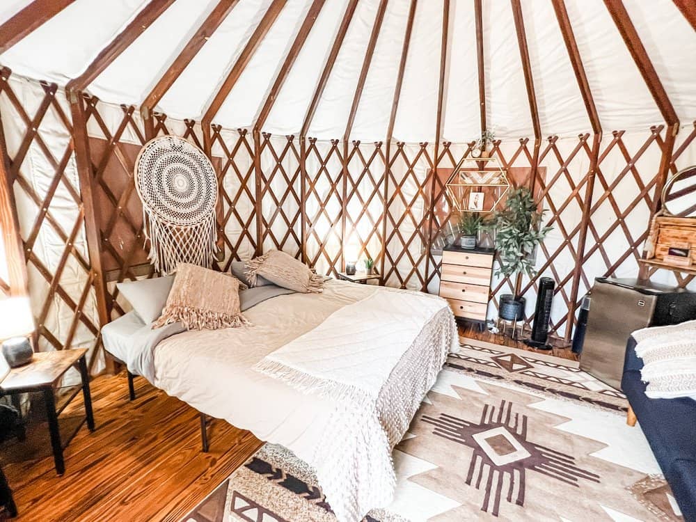 These suites have a king-size bed on a Temperpedic-style mattress and luxury bamboo sheets. On top of this, there is a sofa, a small fridge, and your own fluffy robes. Attached to the porch is a private detached bathroom, beautifully decorated.