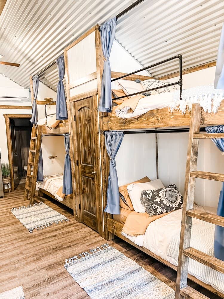 It's a Bunkhouse unlike any you’ve seen before. There are eight built-in bunks with two ensuite bathrooms. Each bunk has its own privacy curtain, night light, and phone charging station, Tempurpedic-style mattresses, luxury bamboo sheets, and fluffy robes for each guest. You can choose the top or bottom bunk upon arrival, depending on your preference.