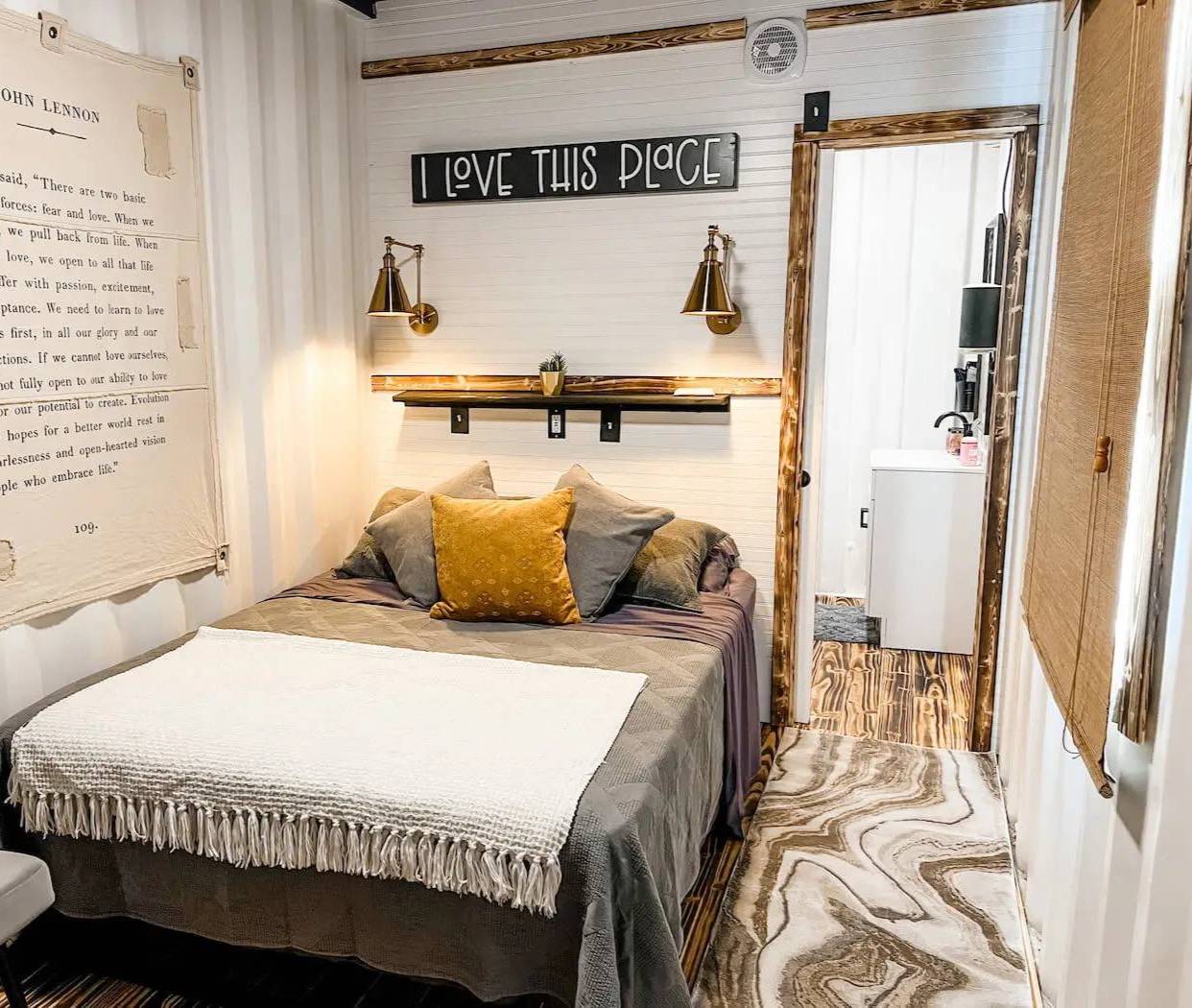 This converted container hosts two separate suites (East and West Villas), each with a Tempurpedic style Queen bed, luxury bamboo sheets, fluffy robes, a small fridge, and an ensuite bathroom. Along with a covered porch is a rooftop deck with a fire pit, accessible from the spiral staircase.