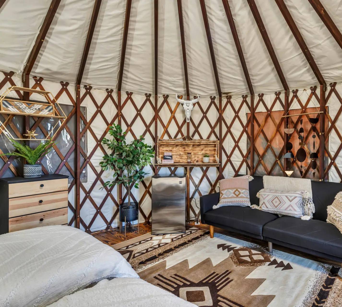 Welcome to the King of Yurts. This suite has a king-size bed (that can be made into 2 twins) on a Temperpedic style mattress and luxury bamboo sheets. On top of this, there is a sofa, a small fridge, and your own fluffy robes. Attached to the porch is a private detached bathroom, beautifully decorated.