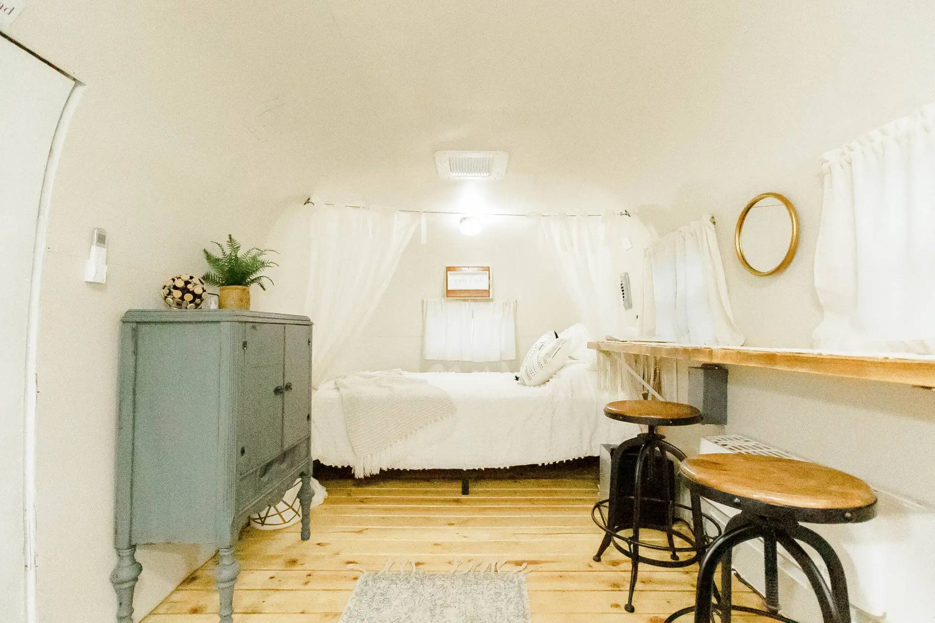 his converted Airstream gives you some wonderful peace and solitude while also providing plenty of space to relax. With a queen Tempurpedic style mattress and a full-size couch to relax, you can slip into the fluffy robe, taking just a few steps to your private detached bathroom. Included with this lodging is a private porch and mini fridge.